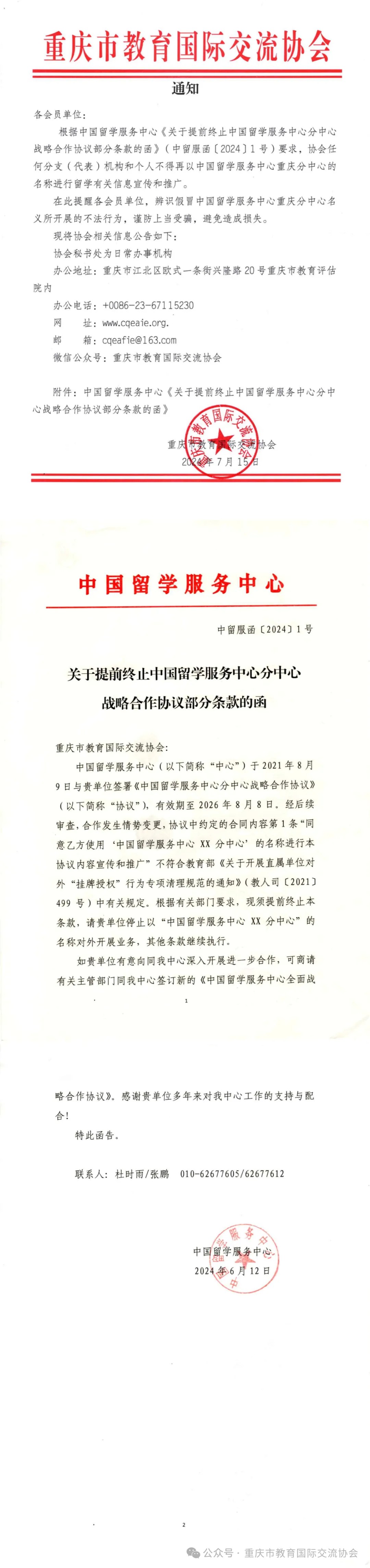 根据中国留学服务中心《关于提前终止中国留学服务中心分中心战略合作协议部分条款的函》(中留服函〔2024〕1号)要求,协会任何分支(代表)机构和个人不得再以中国留学服务中心重庆分中心的名称进行留学有关信息宣传和推广。